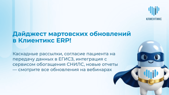 Будьте в курсе всех обновлений месяца в Клиентикс: каскадные рассылки, контроль согласия пациента на передачу данных в ЕГИСЗ, интеграция с сервисом обогащения СНИЛС и два новых отчёта — по группам услуг и конверсии первичных пациентов в повторных