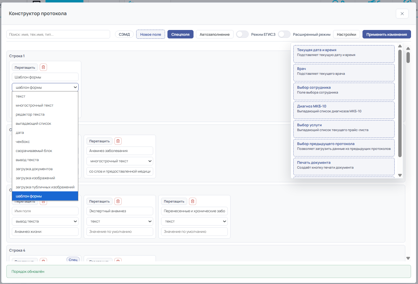 Зайдите в карточку любого протокола и нажмите кнопку «Редактировать». Откроется конструктор с редактором полей. Главное его отличие от прежнего способа настройки: вас не выбрасывает из формы после каждого действия. Создали поле, перетащили на нужное место, добавили ещё одно — всё в одном экране, без перезагрузок.