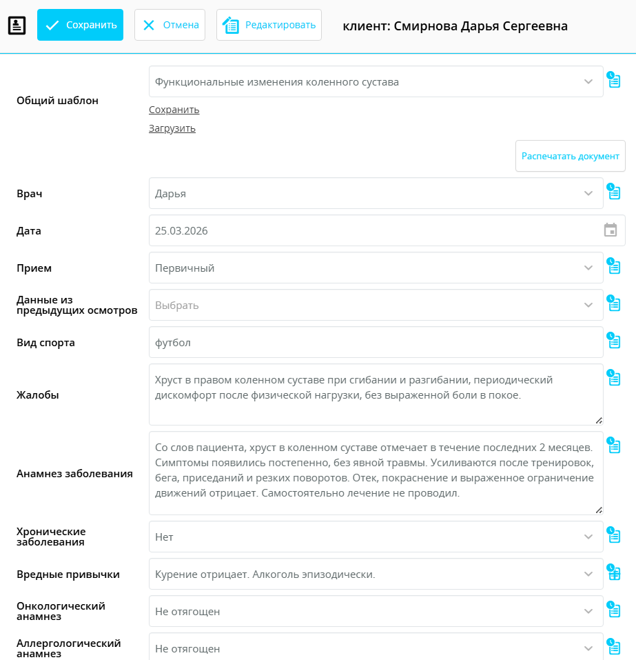 После заполнения дайте ему название и нажмите «Сохранить шаблон» — выбирайте максимально понятное и узнаваемое, чтобы на реальном приеме было легко найти нужный шаблон.