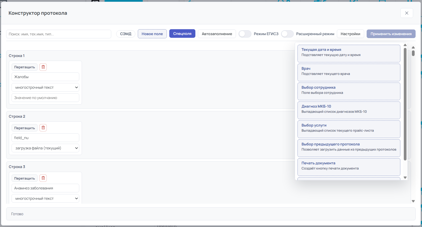 В правой части конструктора находятся готовые специальные поля — их не нужно настраивать с нуля, просто перетащите нужное в протокол: