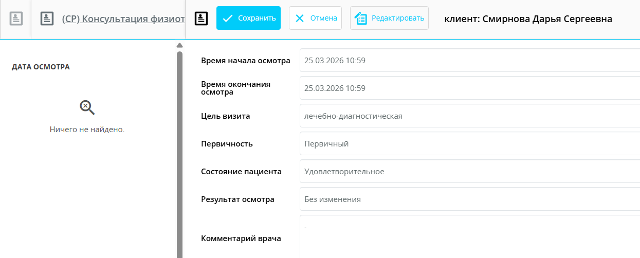 - Поле врача — автоматически подставляет текущего пользователя