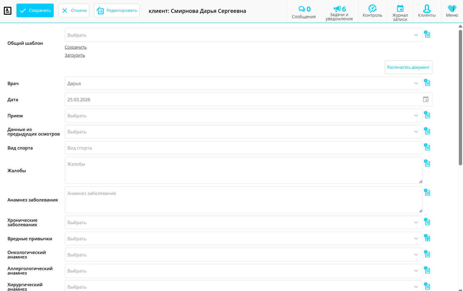 - Шаблон формы — поле для сохранения и загрузки шаблонов осмотра