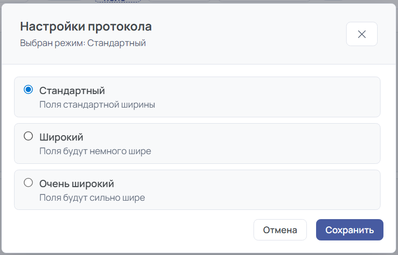 Если ваши врачи не пользуются клиническими рекомендациями или другими виджетами в боковой панели, пустое пространство справа можно убрать. В настройках конструктора выберите «Широкий» или «Очень широкий» режим — поля протокола займут весь экран.