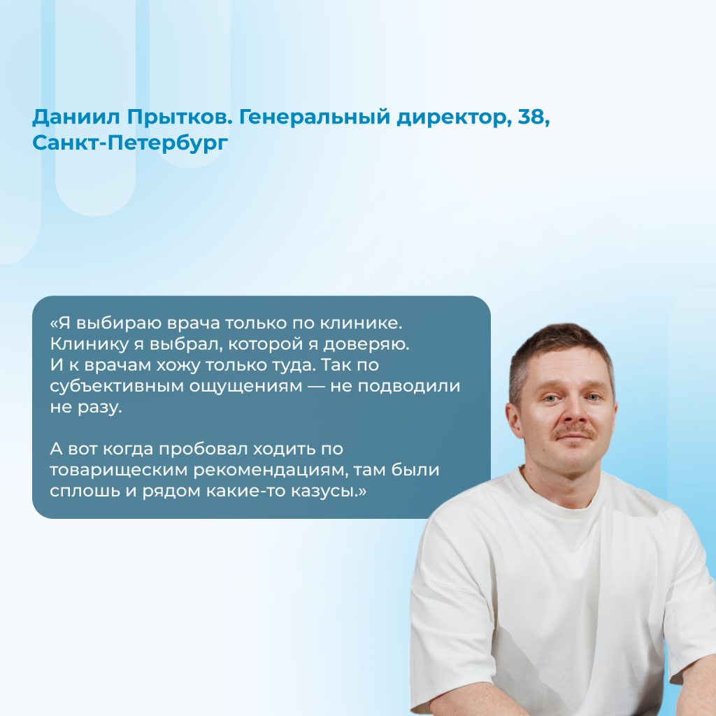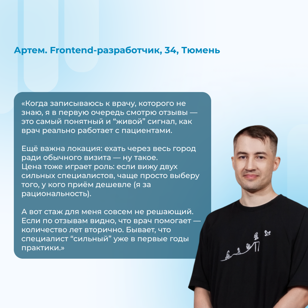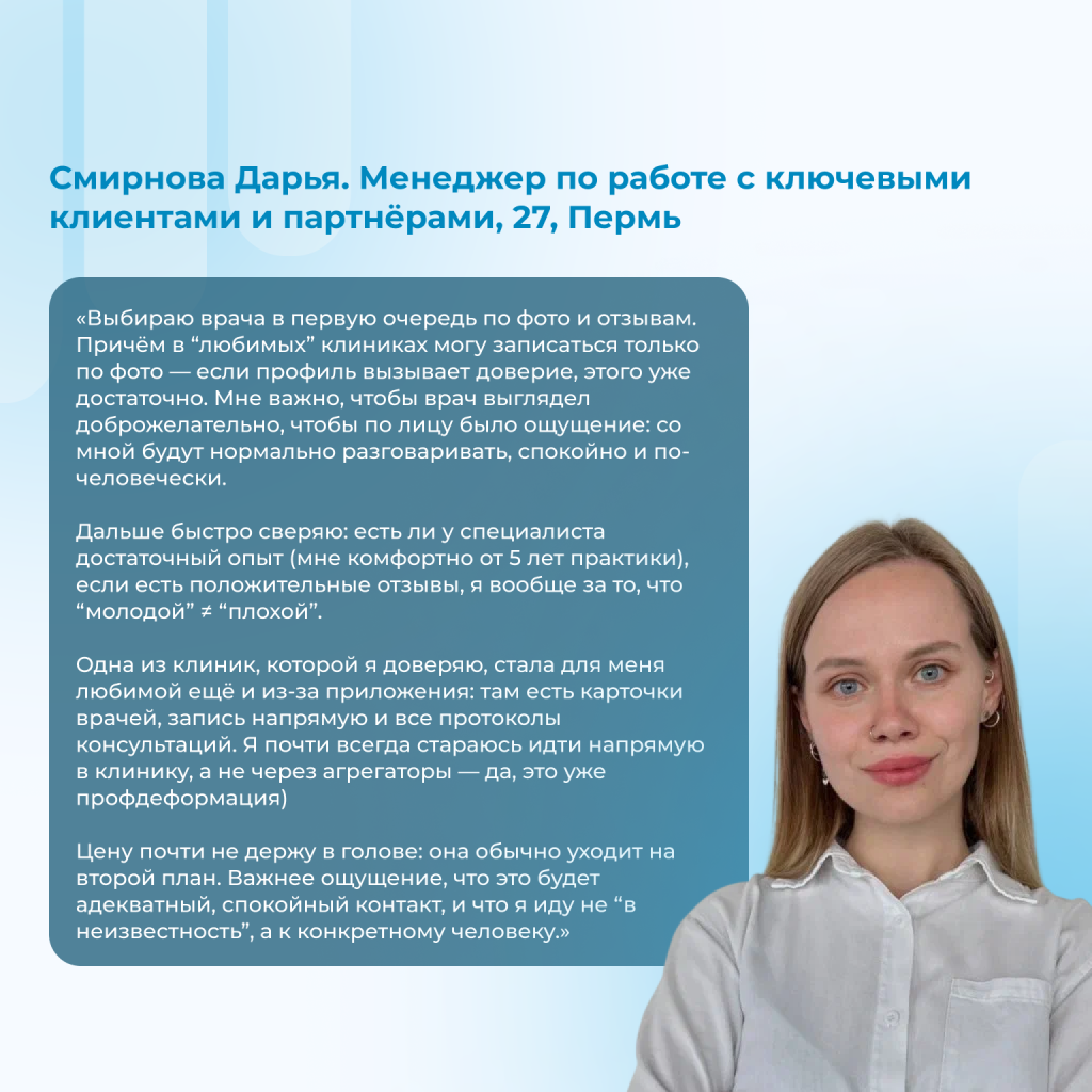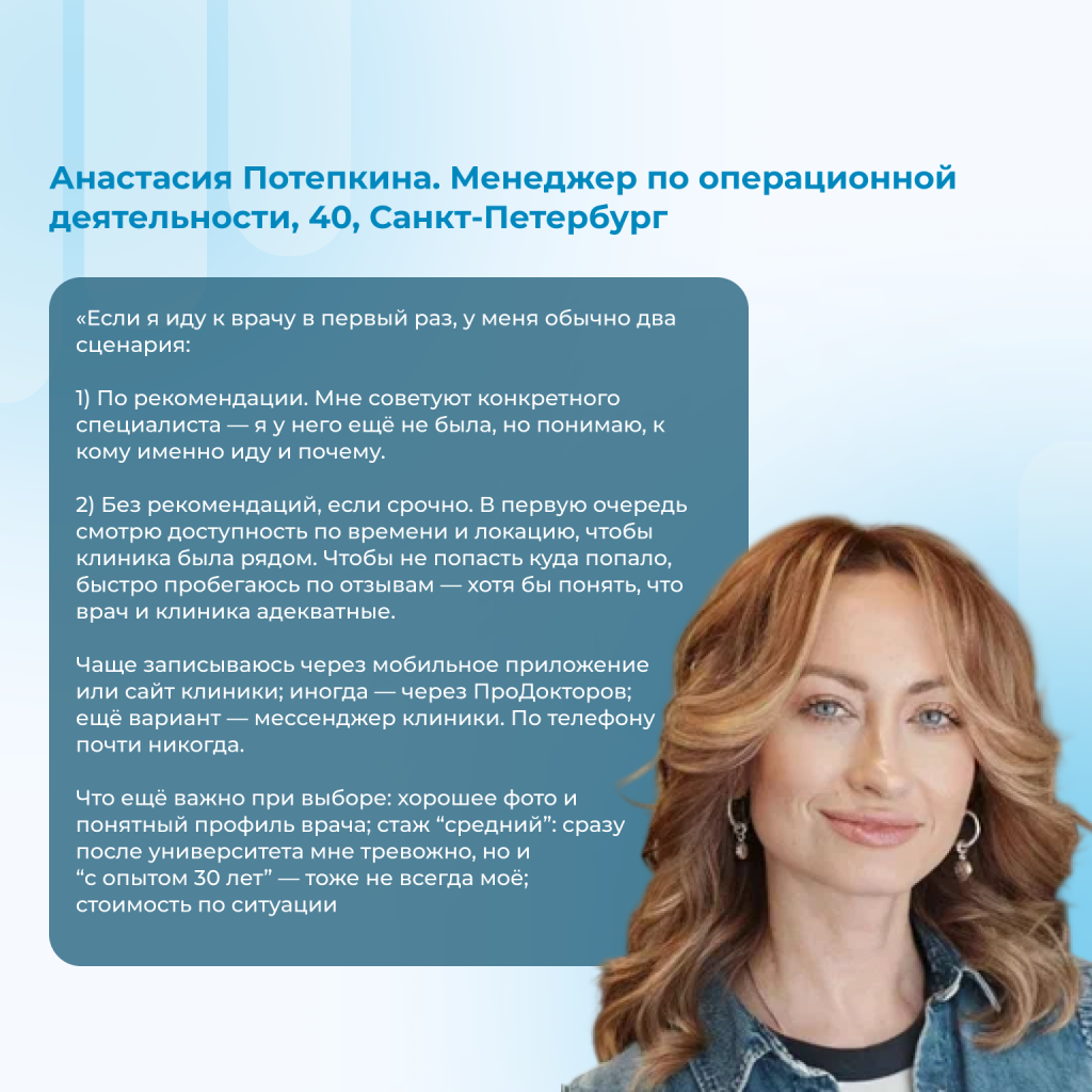 Если собрать всё в одну формулу, то в первичном выборе врача мы чаще всего идем по цепочке: отзывы → профиль/фото → удобно записаться → локация → (для некоторых) стаж → цена (обычно при равных).